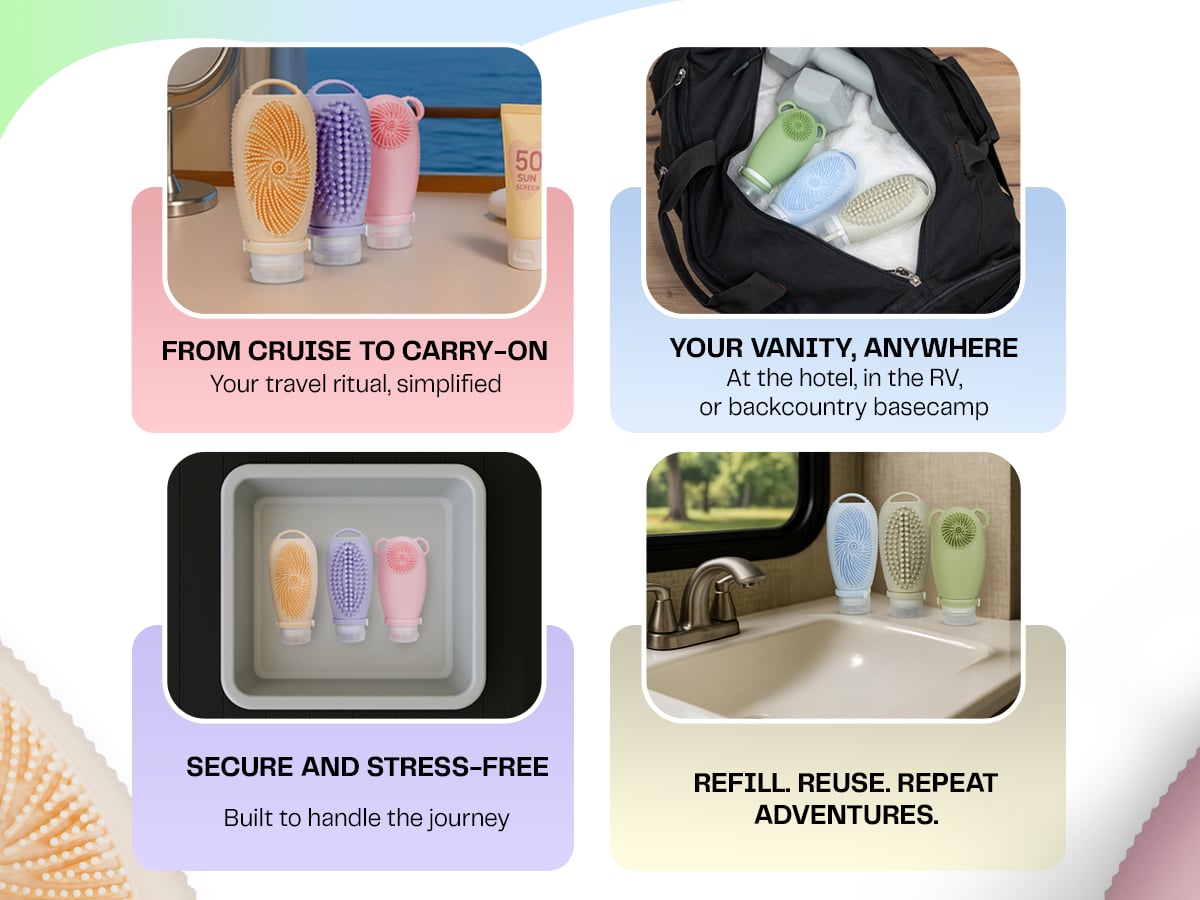 Sumina Horizon Glow Travel Bottles – TSA Approved 3-Pack Silicone Toiletry Containers with Built-In Scrubbers